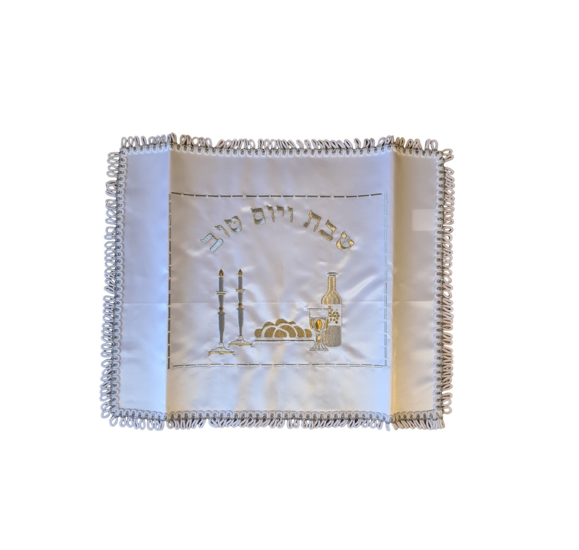 Challah Cover Embroidered with Shabbat Candles And The Hebrew Writing of "for Shabbat and Yom Tov"