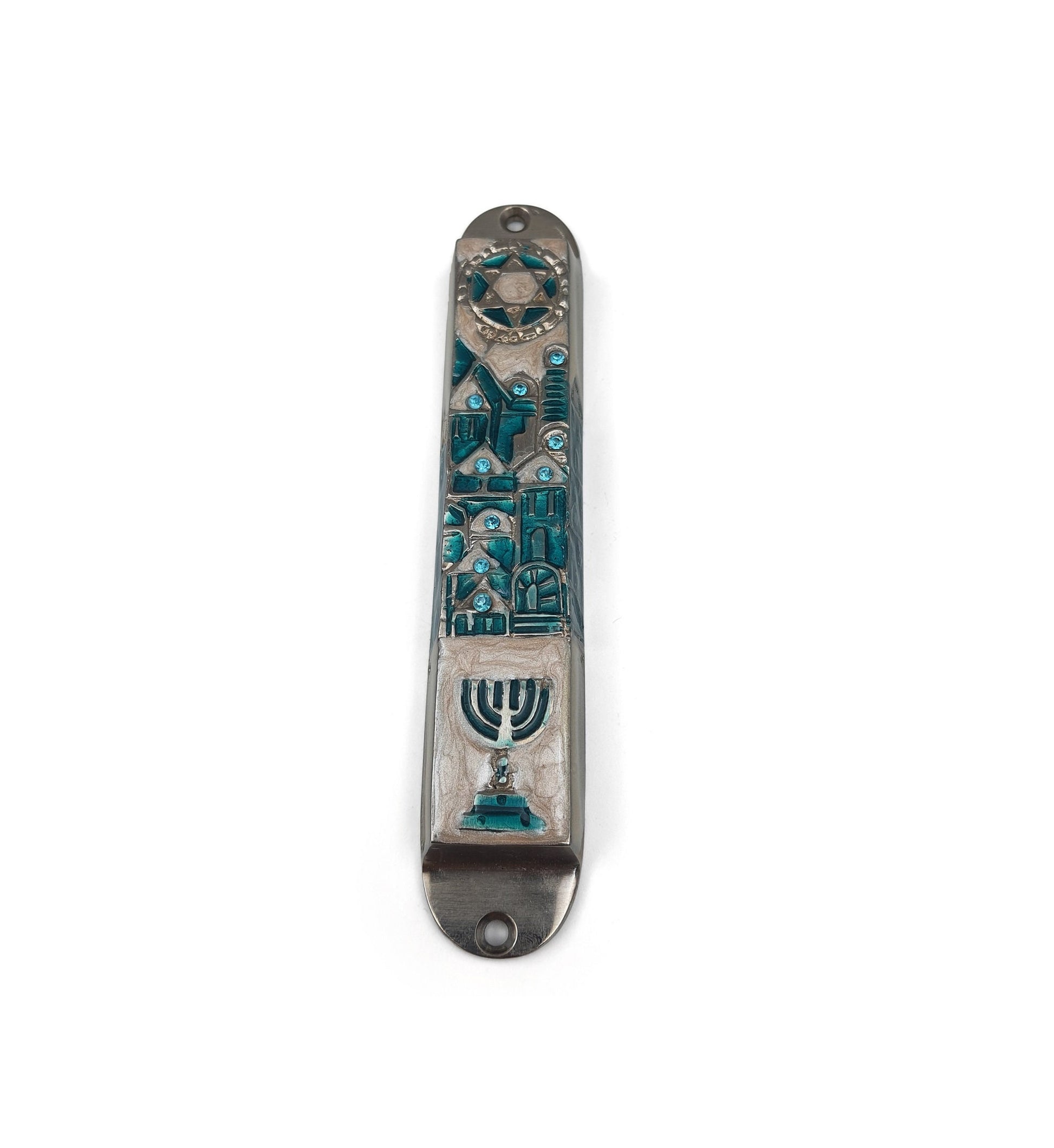 Door Mezuzah Case Design With Menorah & Old City Of jerusalem - For 10 cm Scroll