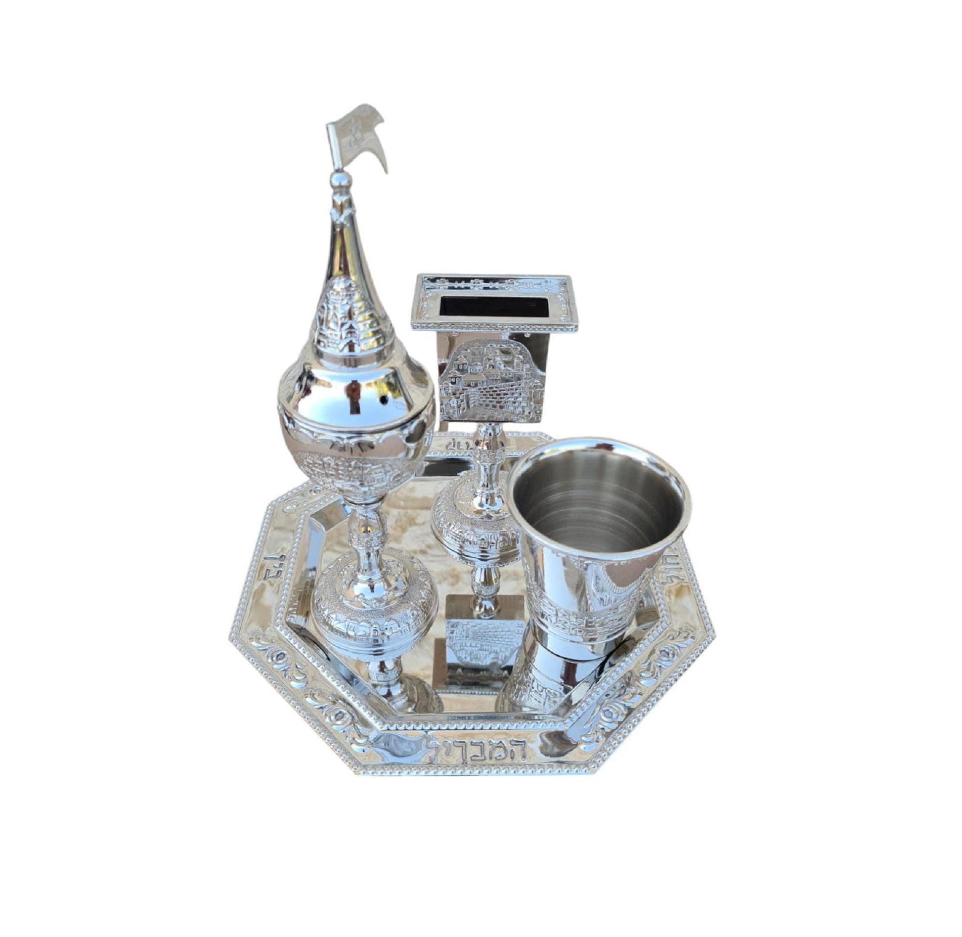 Kiddush Goblet Cup / Besamim / Spice Box (Tower), Candle Holder and a matching Tray