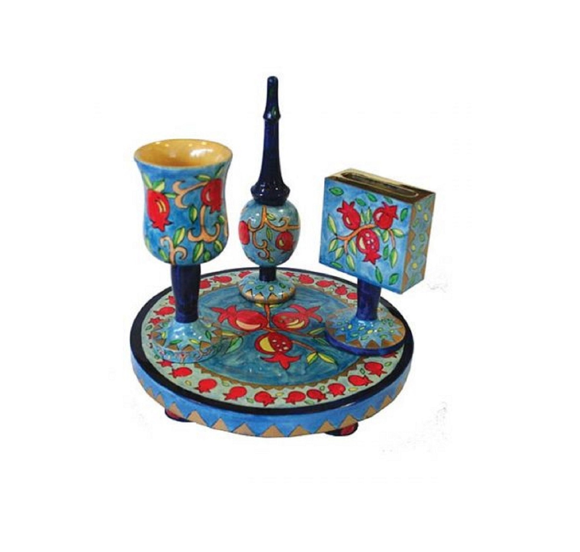 Havdalah Set, pomegranates Painted , Wood Hvdalah Set Havdallah candle Holder, Besamim Box And Wine Cup & Tray, Jerusalem Painted