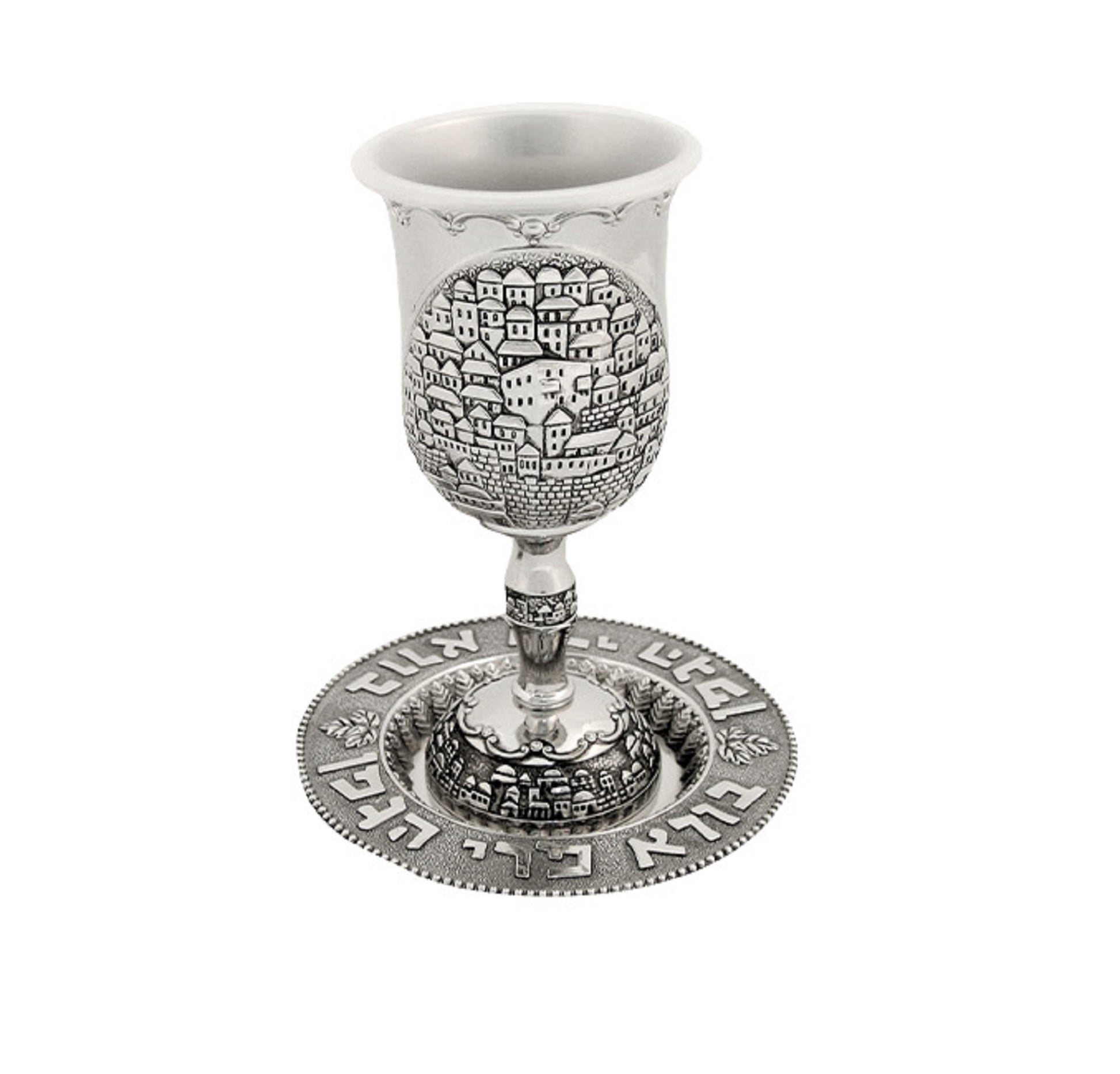 Jewish Kiddush Cup Jerusalem Design, With Matching Plate Engraved The Hebrew Blessing: Creator of The fruit of The Vine
