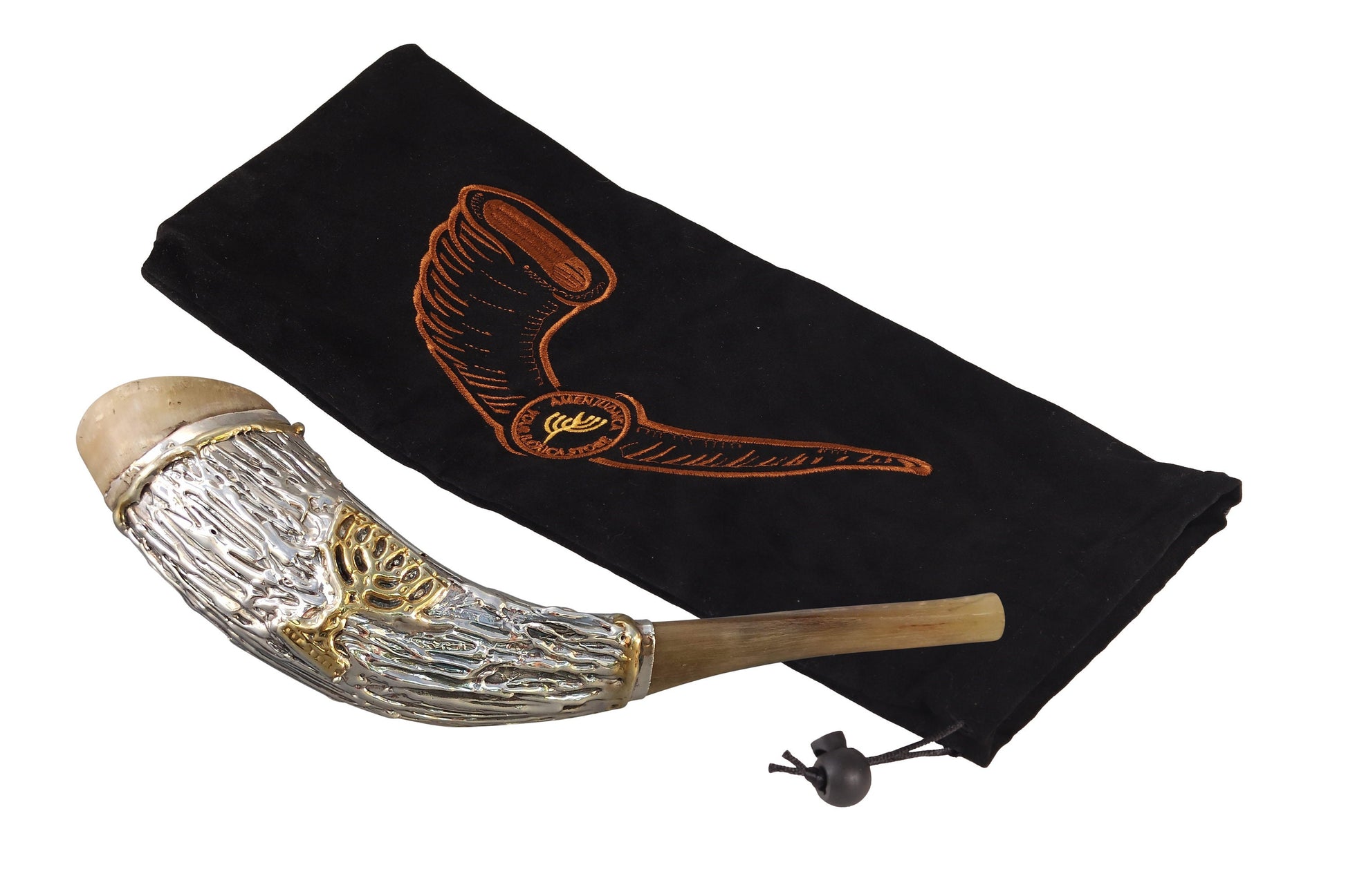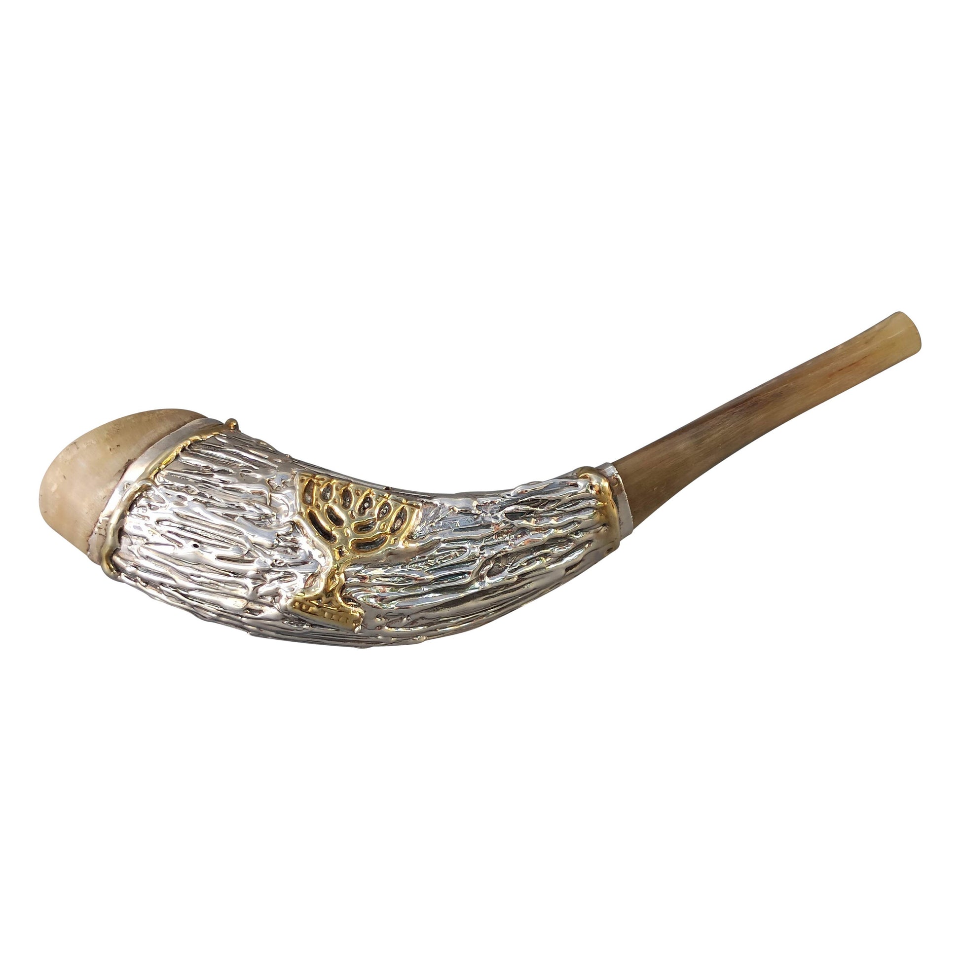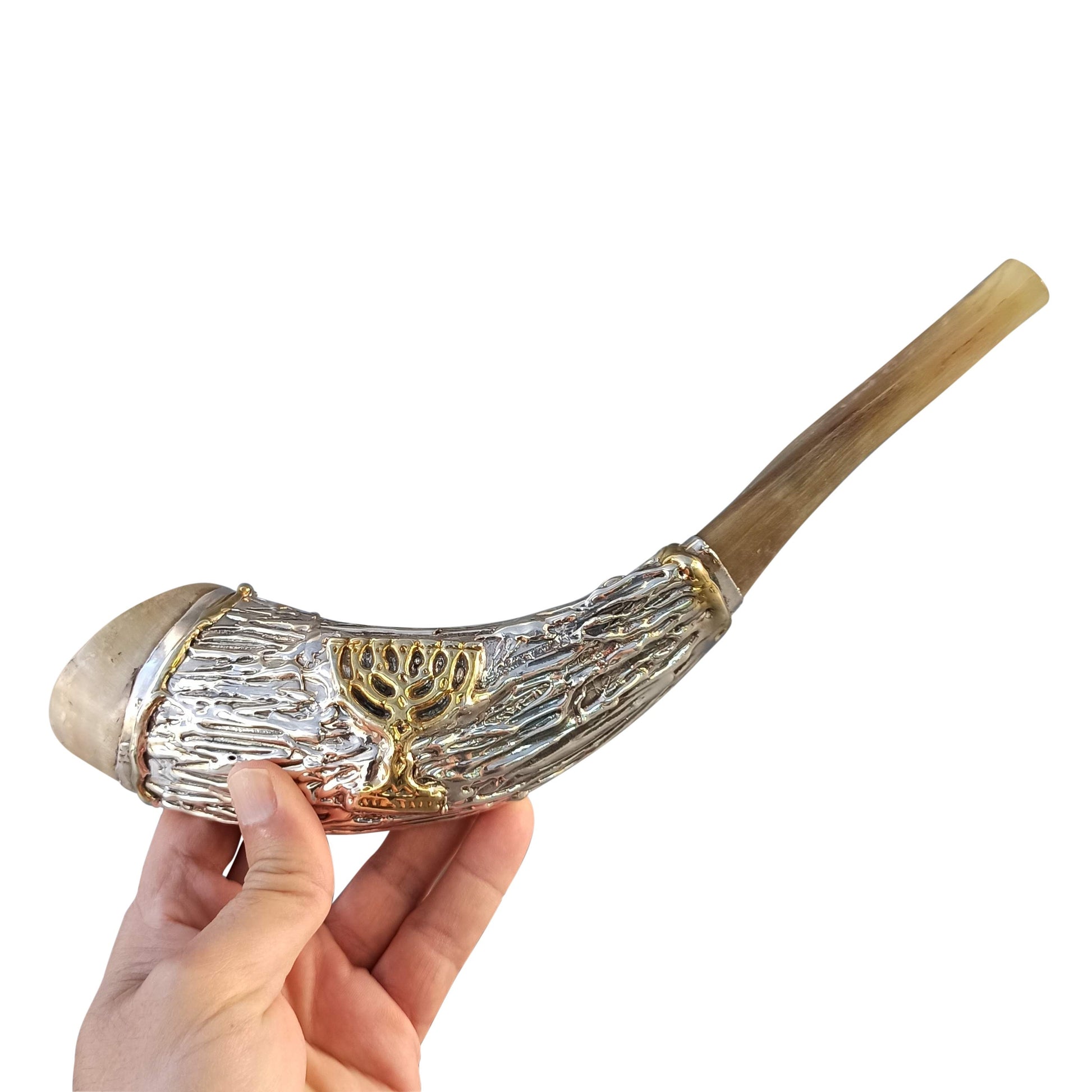 Jewish Shofar Ram Horn 12 -14 Inch Decorated With 7Branch Menorah Silver Plated comes With Velvet Bag